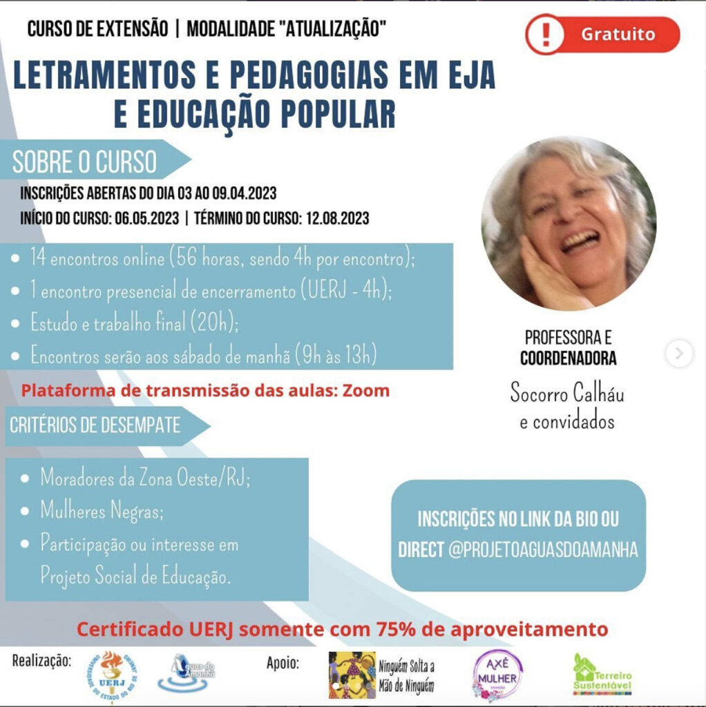 Curso de Extensão “Letramentos e Pedagogias Em EJA e Educação Popular”. A Formação se realizará de modo on line, aos sábados das 9h às 13h, organizados da seguinte forma: 14 encontros online, total de 80h, considerando o tempo dedicado aos estudos e ao Trabalho Final;1 encontro presencial na Uerj, ocasião em que se fará o encerramento. Dispomos de 120 vagas acompanhadas das seguintes cotas:– 20% para estudantes da Uerj (presencial e à distância);– 20% para voluntários do projeto Águas do Amanhã e parceiros;– 20% para mulheres que atuem como educadoras populares.As demais vagas são destinadas à ampla concorrência. Caso necessário, utilizaremos os seguintes critérios de seleção:– pessoas residentes no território da zona oeste do Rio de Janeiro;– mulheres negras;– pessoas com participação ou interesse em instituições ou Projetos Sociais de Educação Popular.