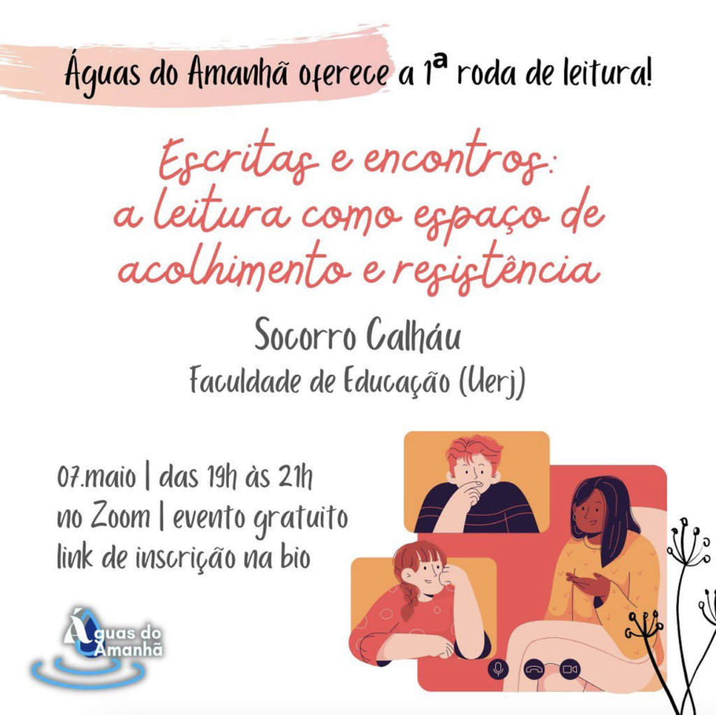 Projeto Águas do Amanhã, juntamente com a professora Socorro Calháu queremos convidar você para um encontro com a leitura e a (re) descoberta de si. Em meio a um cenário difícil de isolamento social, o cuidado com nossas emoções se tornou cada vez mais necessário, e acreditamos que a leitura e a escrita são ferramentas fundamentais nesse processo. Dando-nos a sensação de que não estamos sozinhos, nos possibilitando percorrer mundos, cenários e, principalmente, contando histórias que nos atravessam. Quantas vezes fomos tomados por um livro a ponto de quase nos sentirmos abraçados por ele? Por isso, a 1ª roda de leitura propõe levar você a uma viagem de fora pra dentro. E nada melhor do que percorrer esse caminho na companhia de Socorro Calháu, Cora Coralina, Geni Guimarães e Graciliano Ramos. Então fique à vontade e pode entrar!..IMPORTANTE: após a inscrição, enviaremos por e-mail o link da sala e o material que conduzirá nosso encontro. A realização da tarefa é pré-requisito para participar da roda! Pedimos que sigam as sugestões do arquivo e o aproveitem para fazer uma viagem para dentro de si! Criem de forma livre e espontânea!..#PraCegoVer#PraTodosVerem: Cartaz com fundo branco. No canto superior esquerdo está escrito: “Águas do amanhã oferece – 1ª roda de leitura, evento gratuito”, sob um fundo rosa, que imita um traço feito a pincel. No centro, com letra rosa em caixa alta, está escrito: ESCRITAS E ENCONTROS: A LEITURA COMO ESPAÇO DE ACOLHIMENTO E RESISTÊNCIA. Abaixo do texto, também centralizado, está o nome da dinamizadora: SOCORRO CALHÁU – FACULDADE DE EDUCAÇÃO (UERJ).No canto inferior direito, há uma figura representando três pessoas conversando sob um fundo de quadrados nas cores laranja e amarelo, e um ramo de flores. No canto inferior esquerdo estão as informações de dia, horário, e link para a inscrição: 07 de maio, das 19h às 21h, no Zoom, evento gratuito, link de inscrição na Bio. Ainda no canto inferior esquerdo, encontra-se a logo do projeto. .